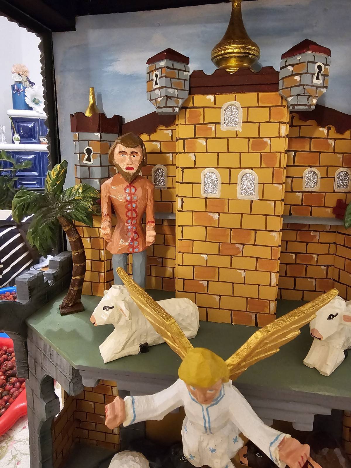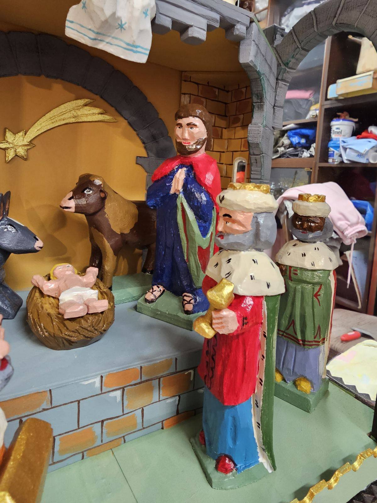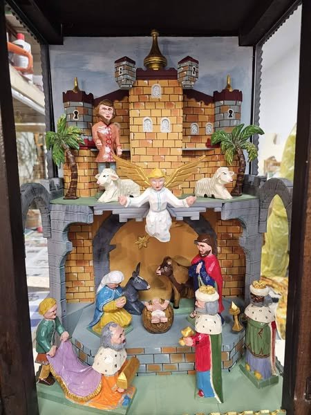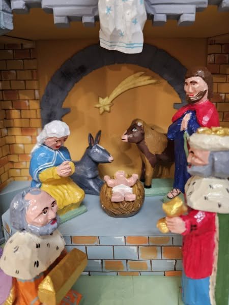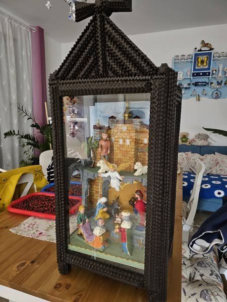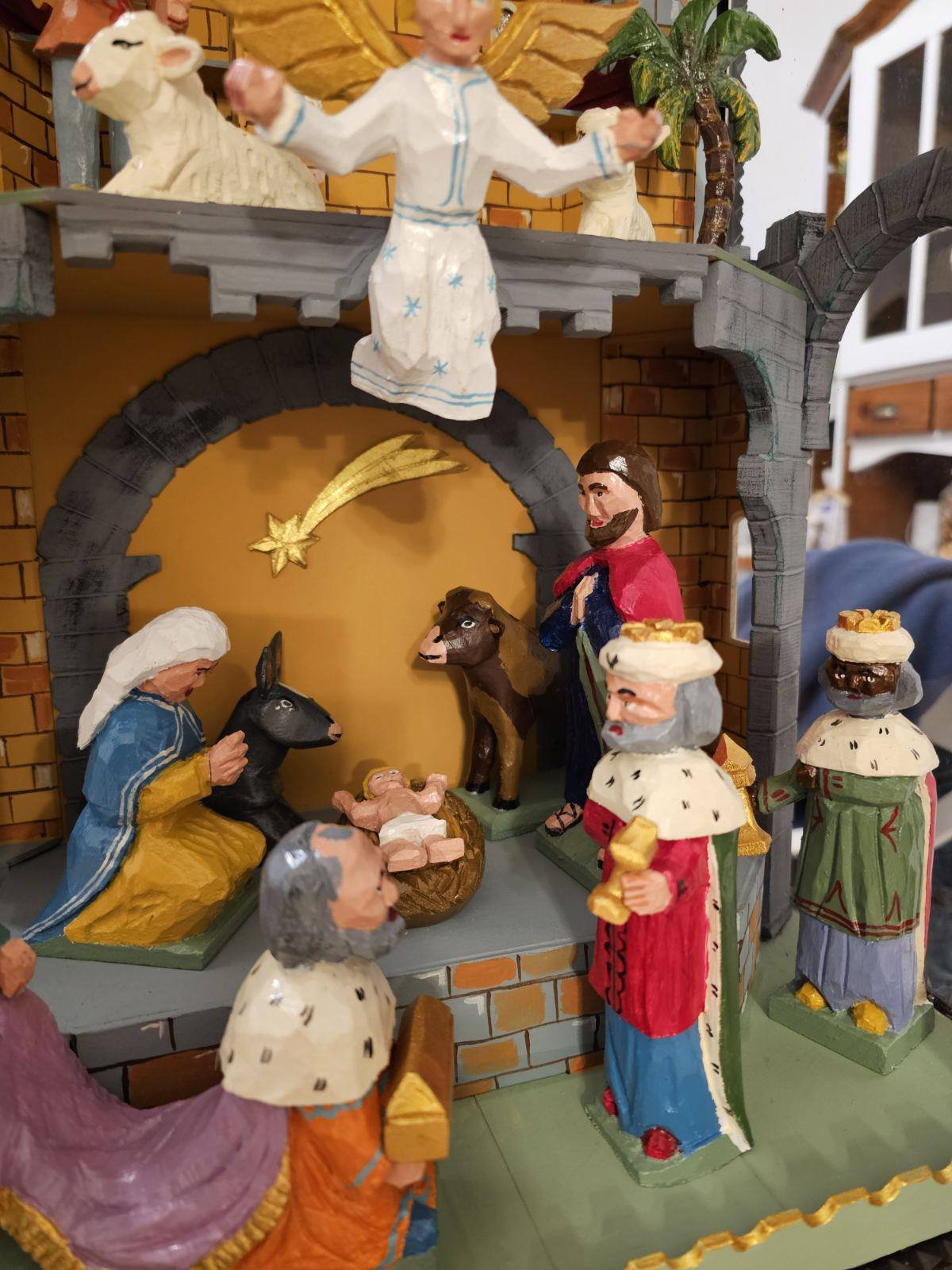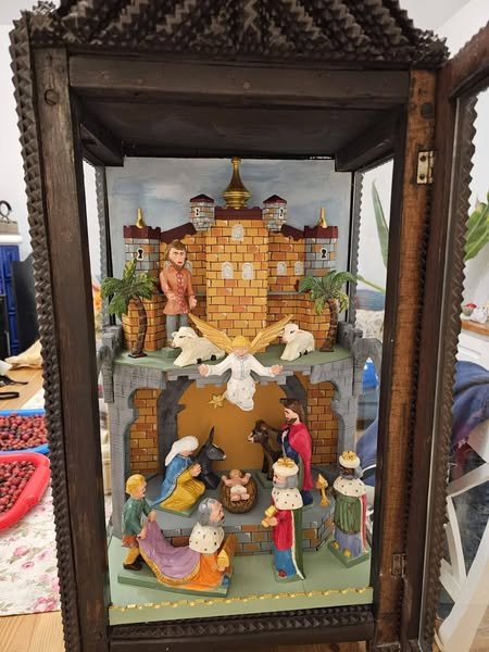Muzeum hraček Stuchlíkovi nabízí k prodeji nádherný skříňový betlém, figurky dřevěné v polychromii, velikost stojících figur je 13 cm, výška skříňky je 85 cm, šířka 35 cm, hloubka 27 cm.